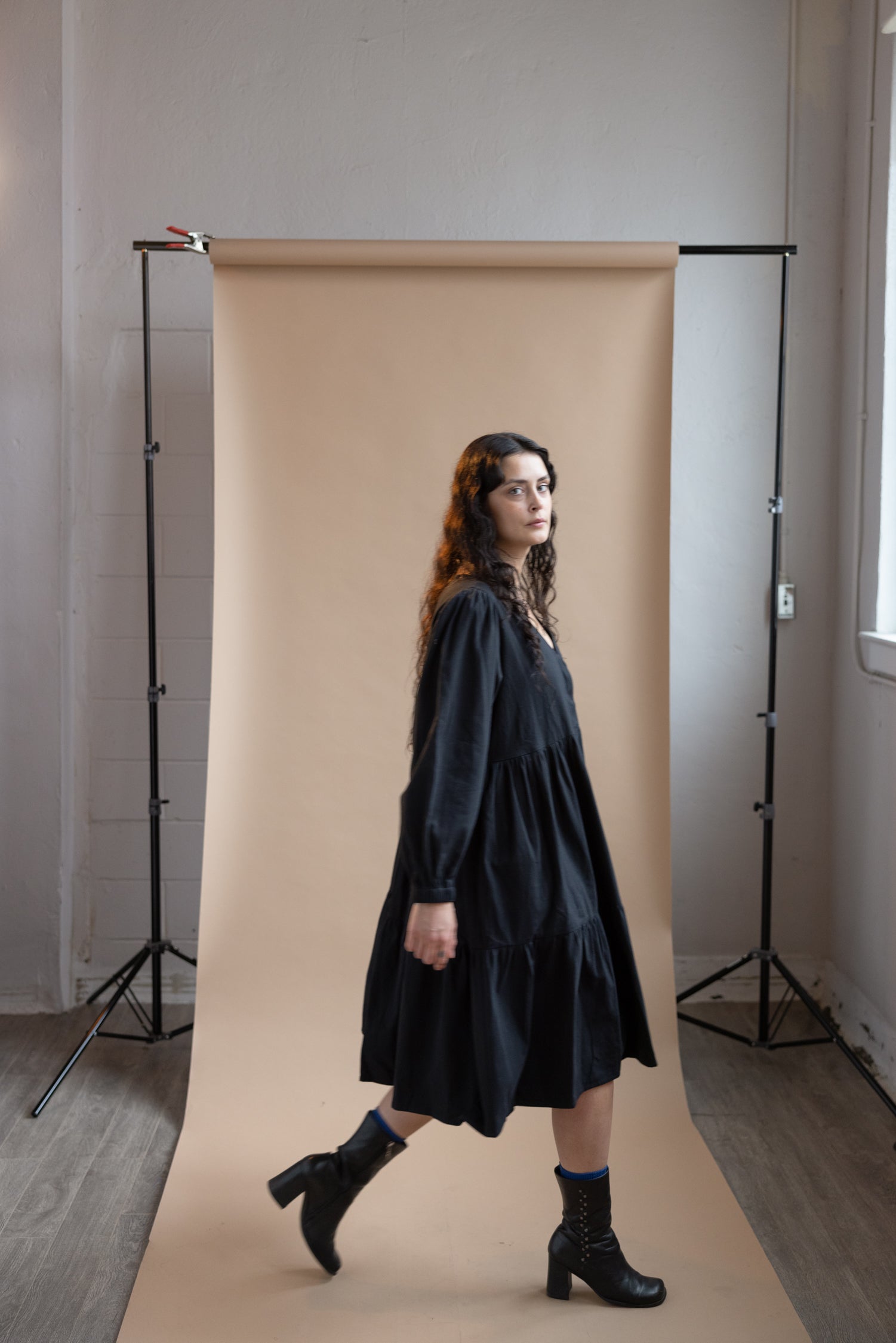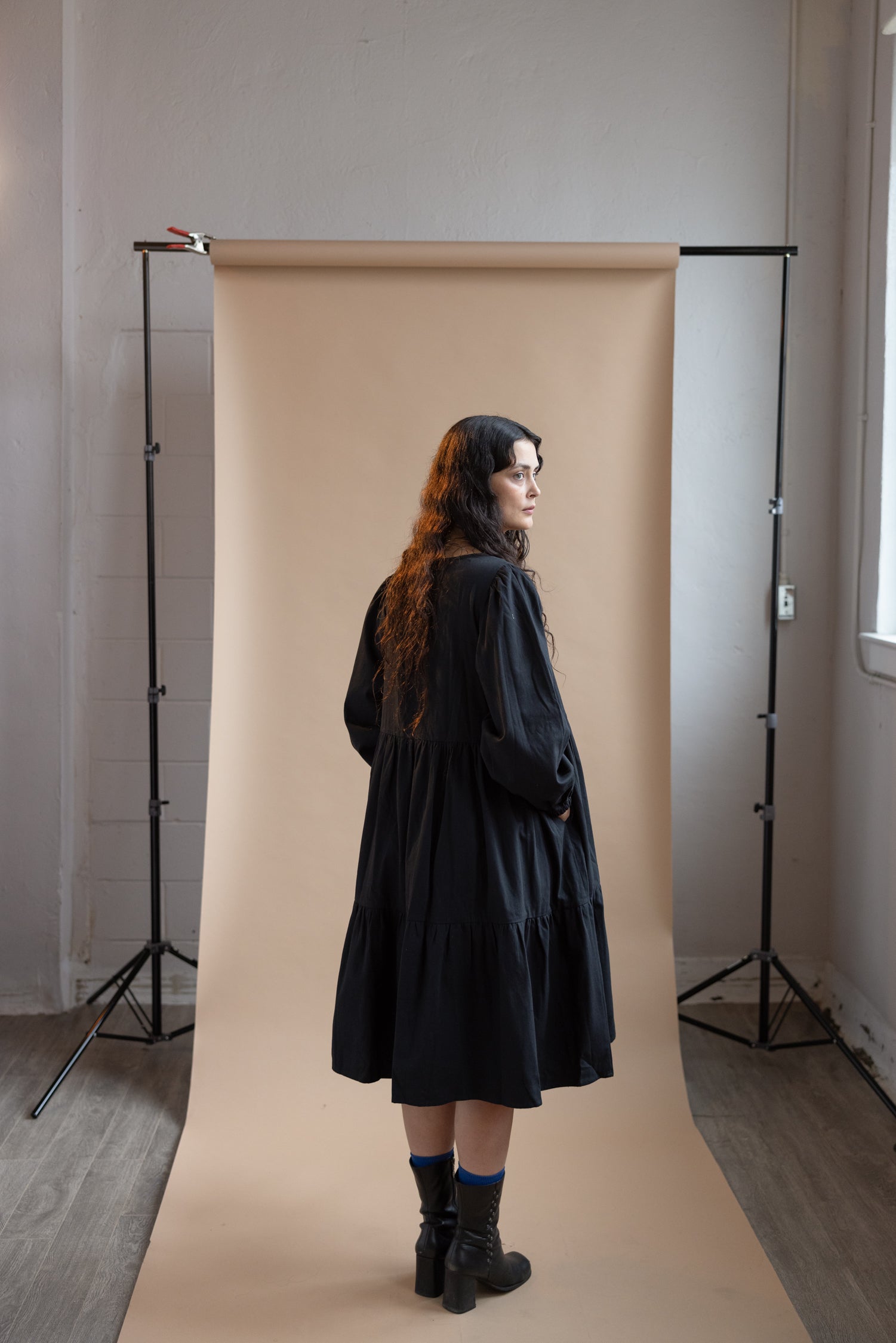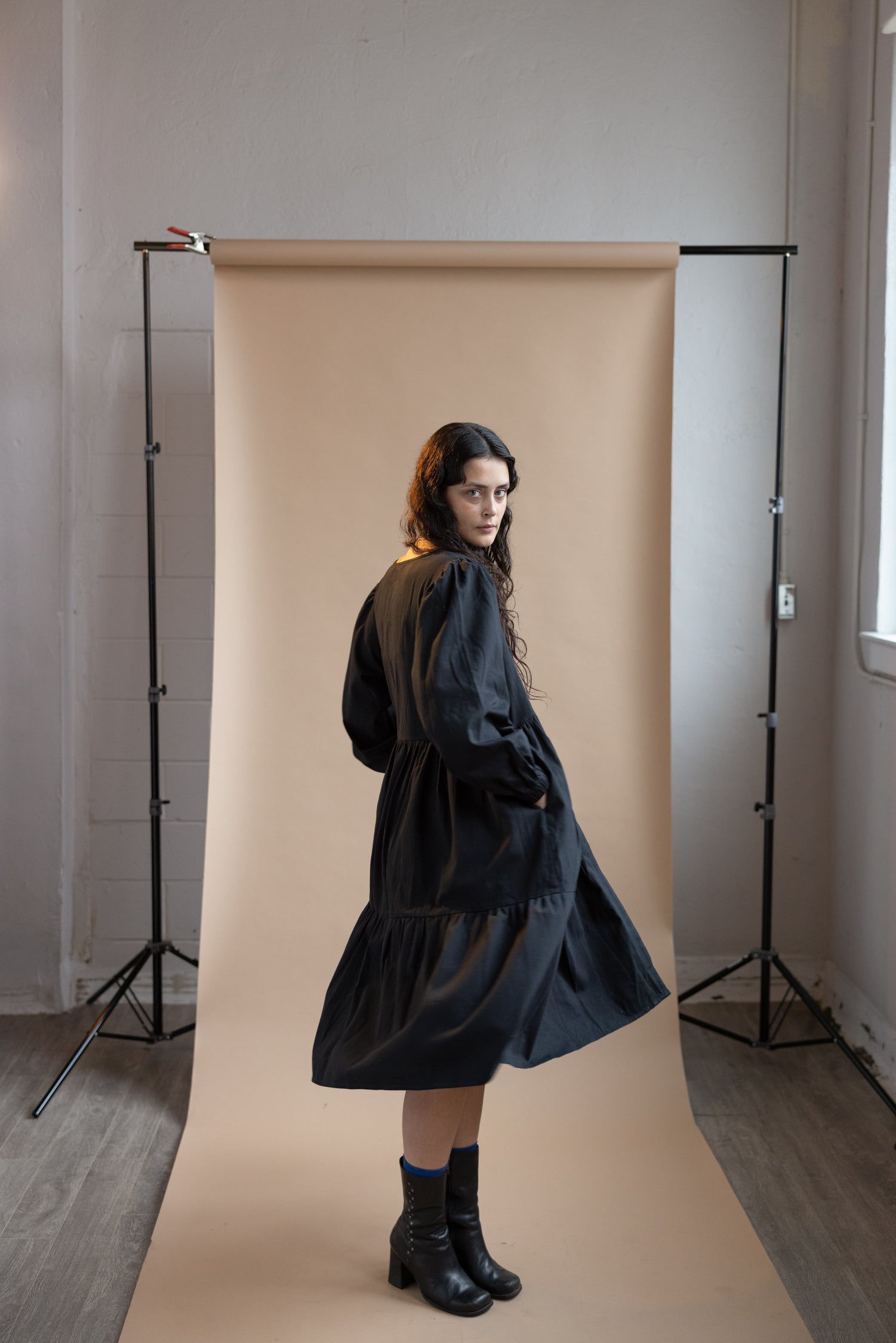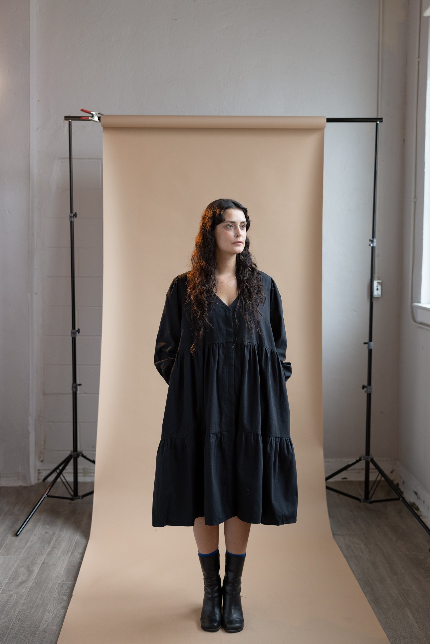 The Autumn dress is made with a soft, medium weight organic cotton twill. There are pockets sewn into the side seams and buttons all the way down the front. This dress is perfect on its own or can be worn as a layering piece. The fit is easy, you can wear it oversized or close to the body, pay most attention to the chest measurement!