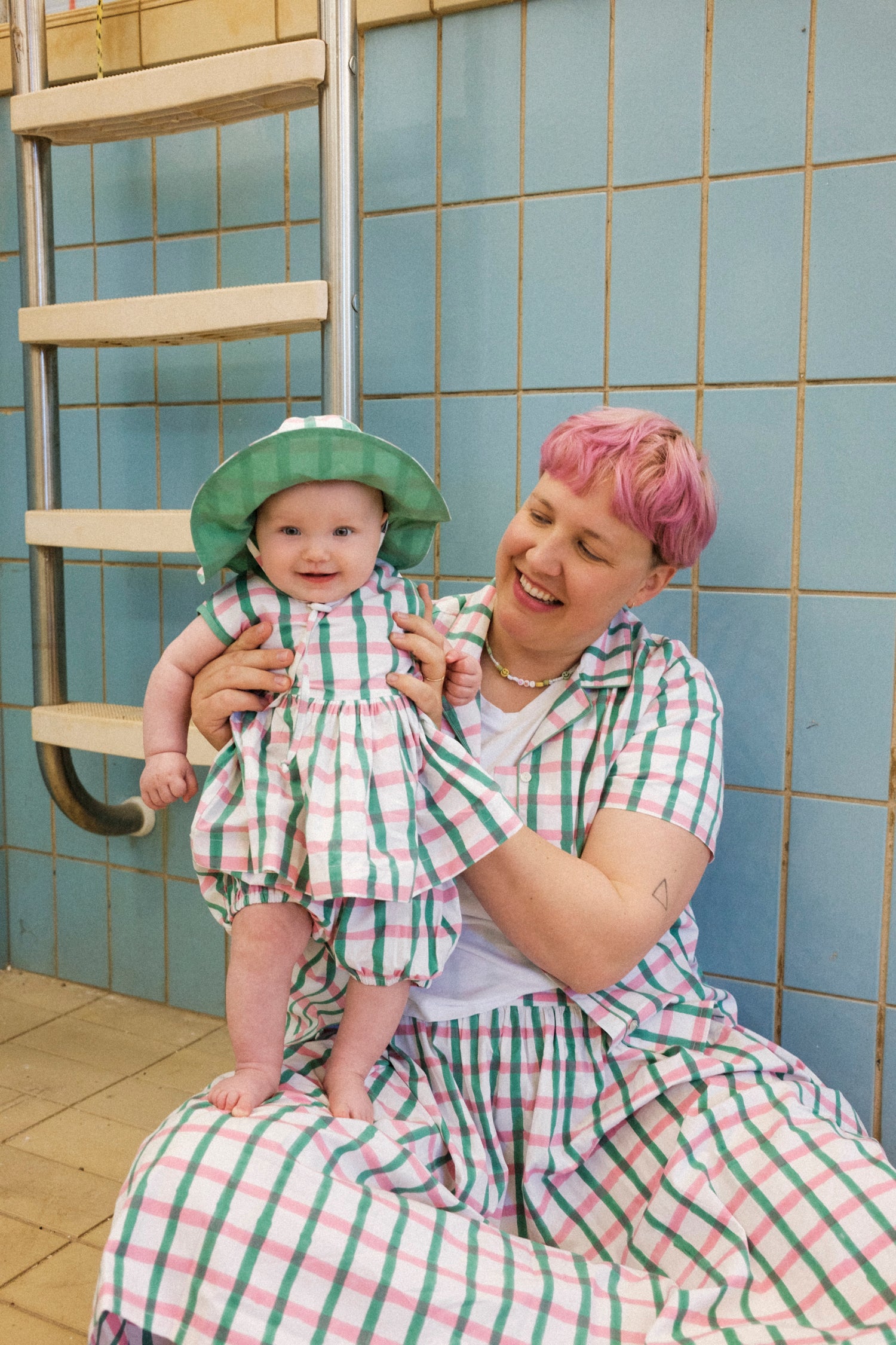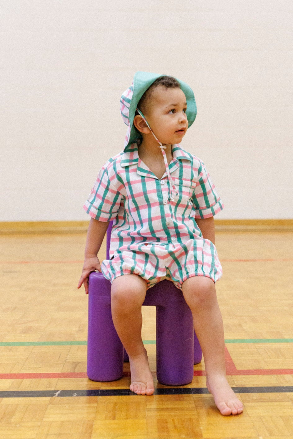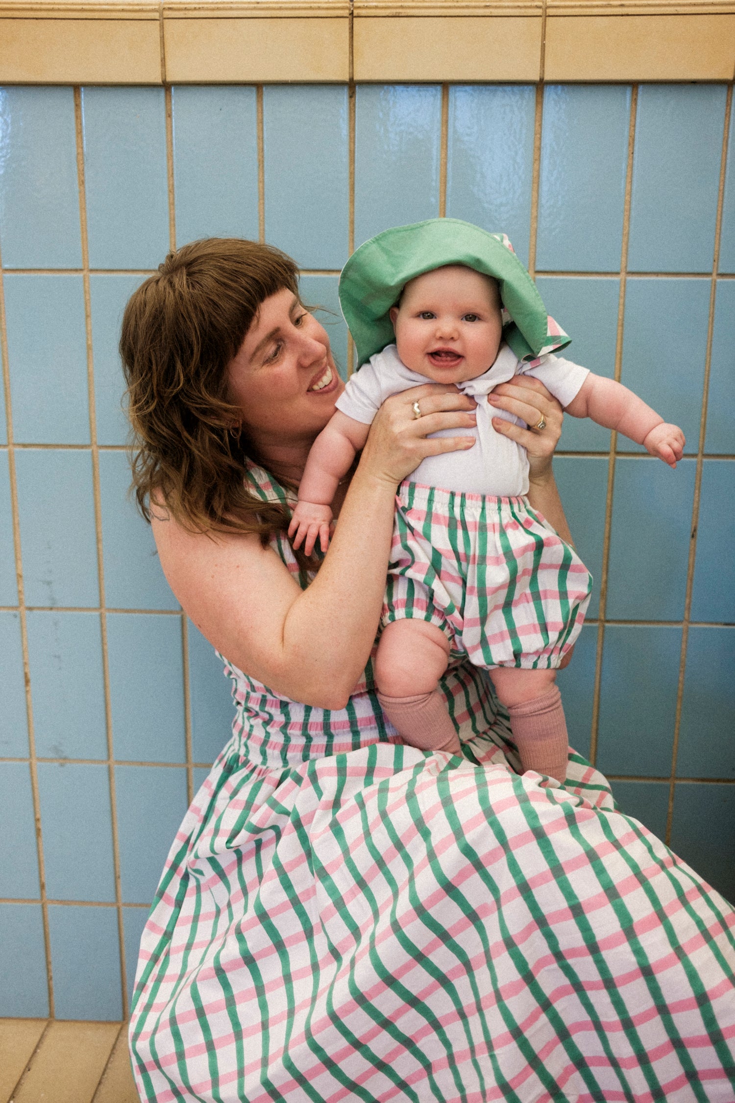 These soft, elastic-waist bloomers are made from lightweight organic cotton poplin, hand block printed in our Lawn Chair check. They’ve got a roomy shape and gathered leg openings—perfect for crawling, toddling, or layering under dresses.