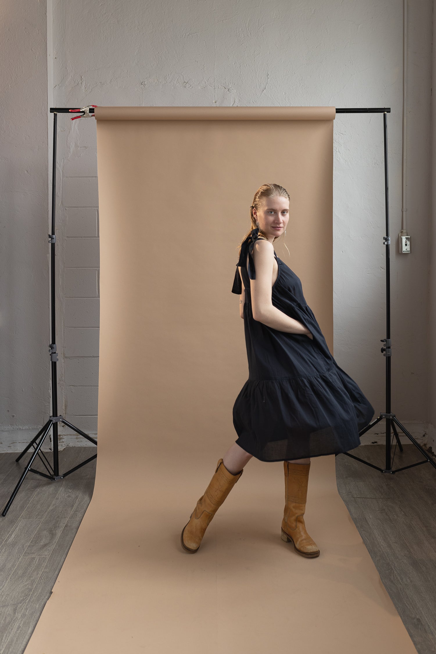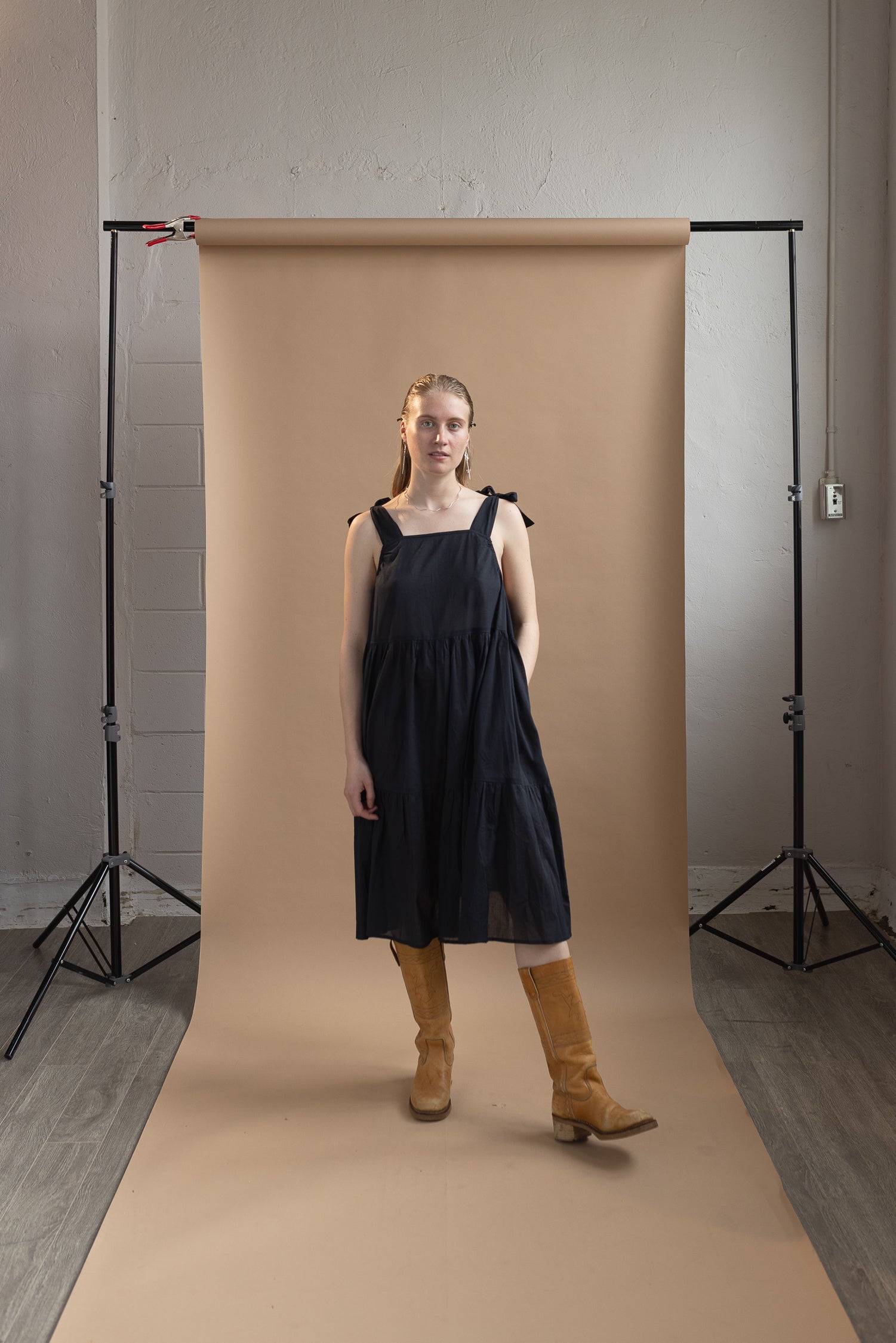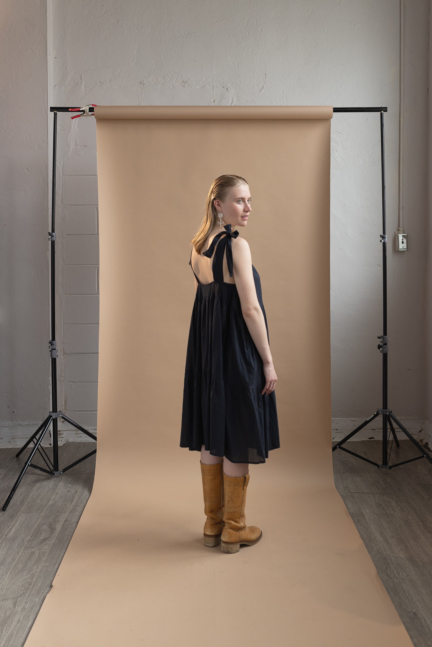 This dress is made with a very light weight cotton voile, almost sheer so think about what you'll wear underneath! There are adjustable straps so you can play with torso length and an underarm elastic for ease of fit and comfort. This dress is available in size 1-3.