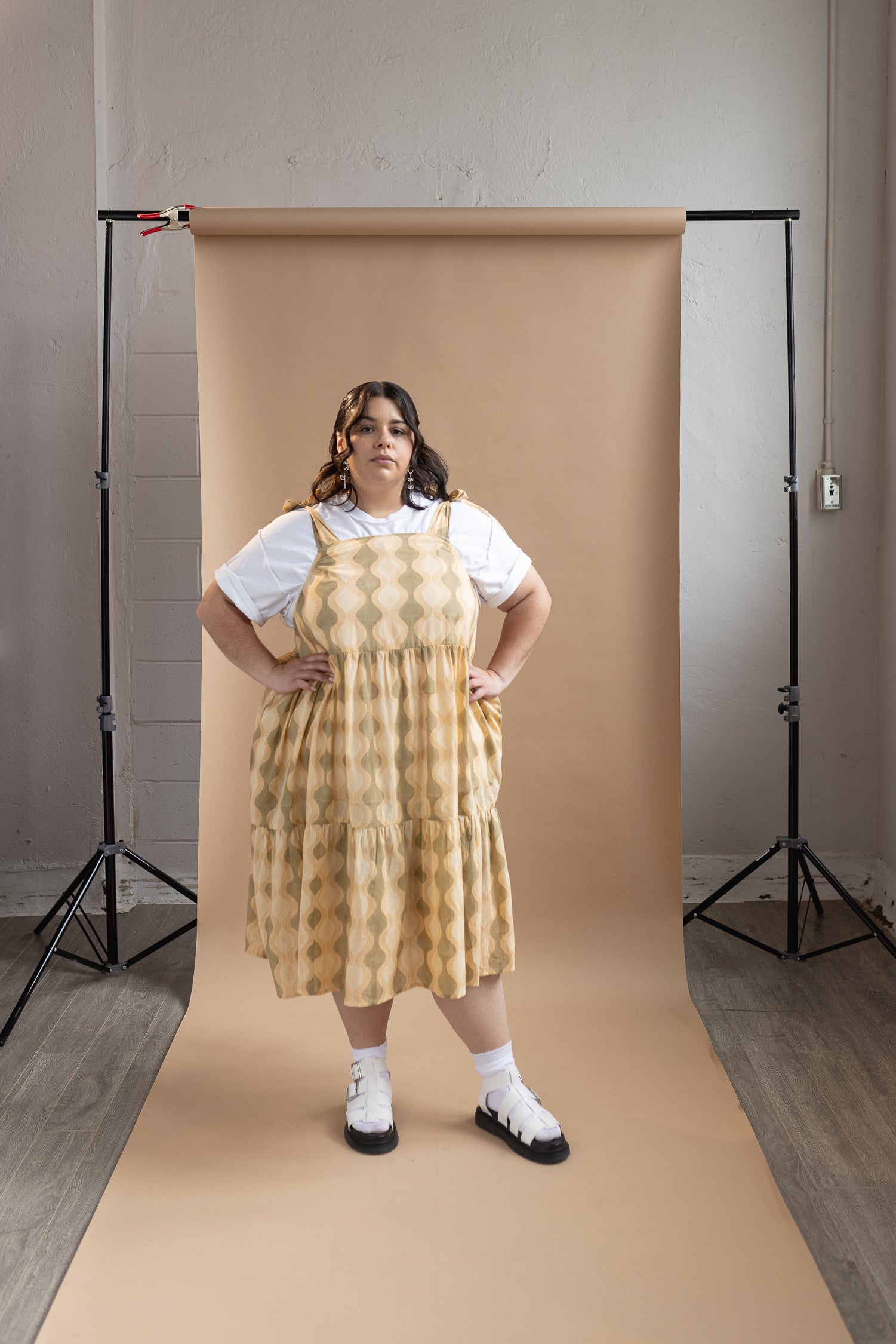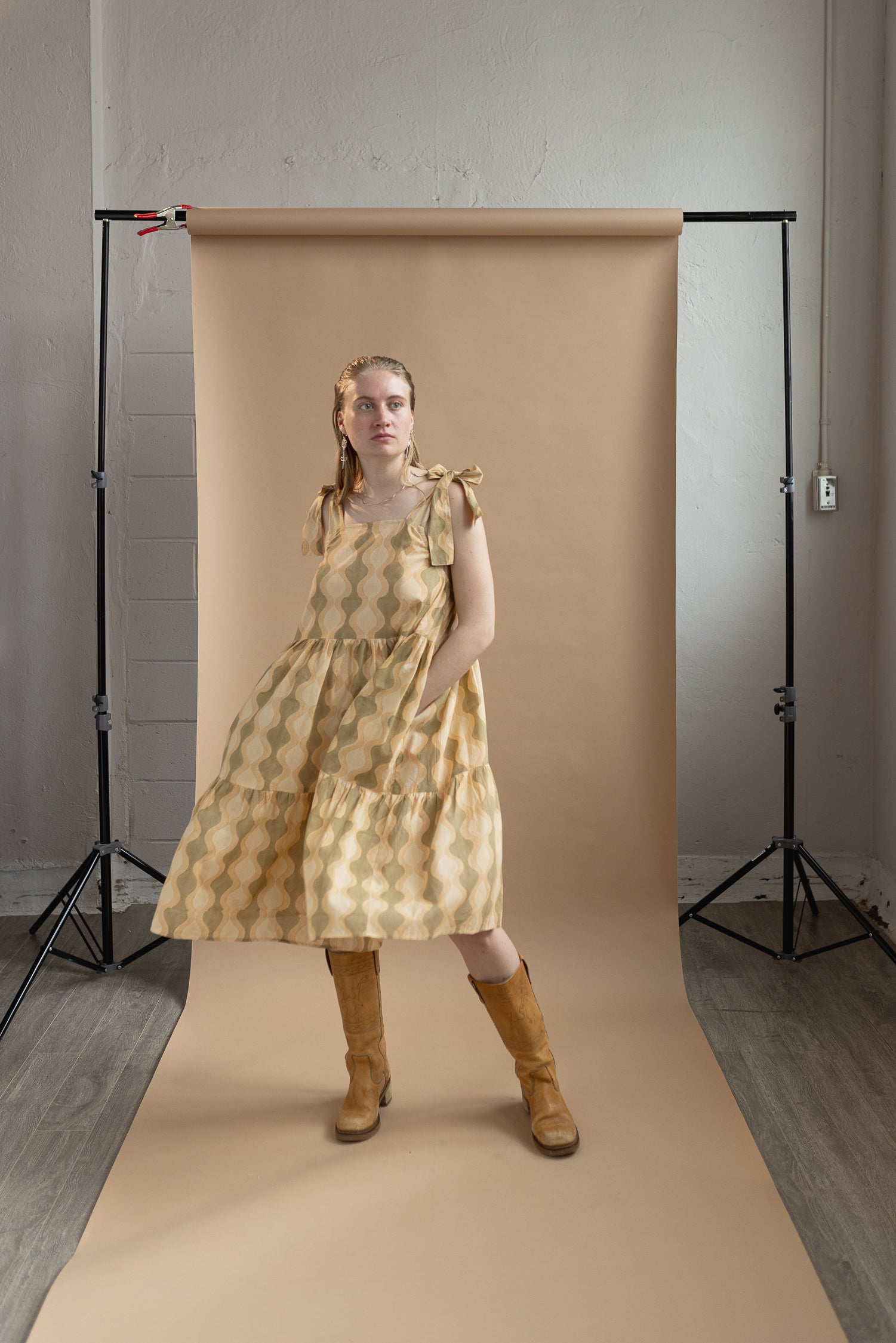 This dress is made with a hand block printed, light weight, cotton voile, almost sheer- think about what you'll wear underneath! There are adjustable straps that let you play with torso length and an underarm elastic for ease of fit and comfort. This dress is available in size 1-3.