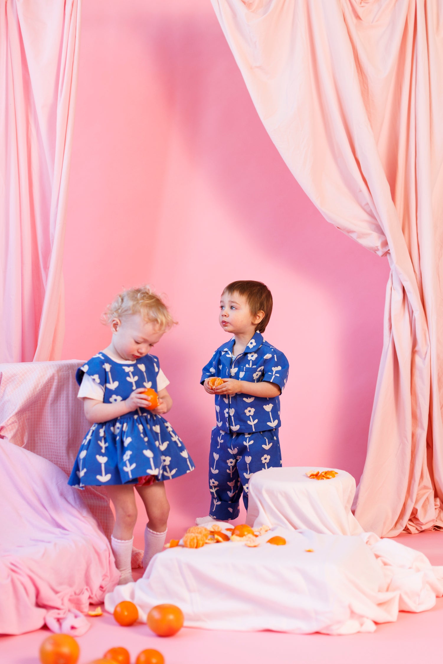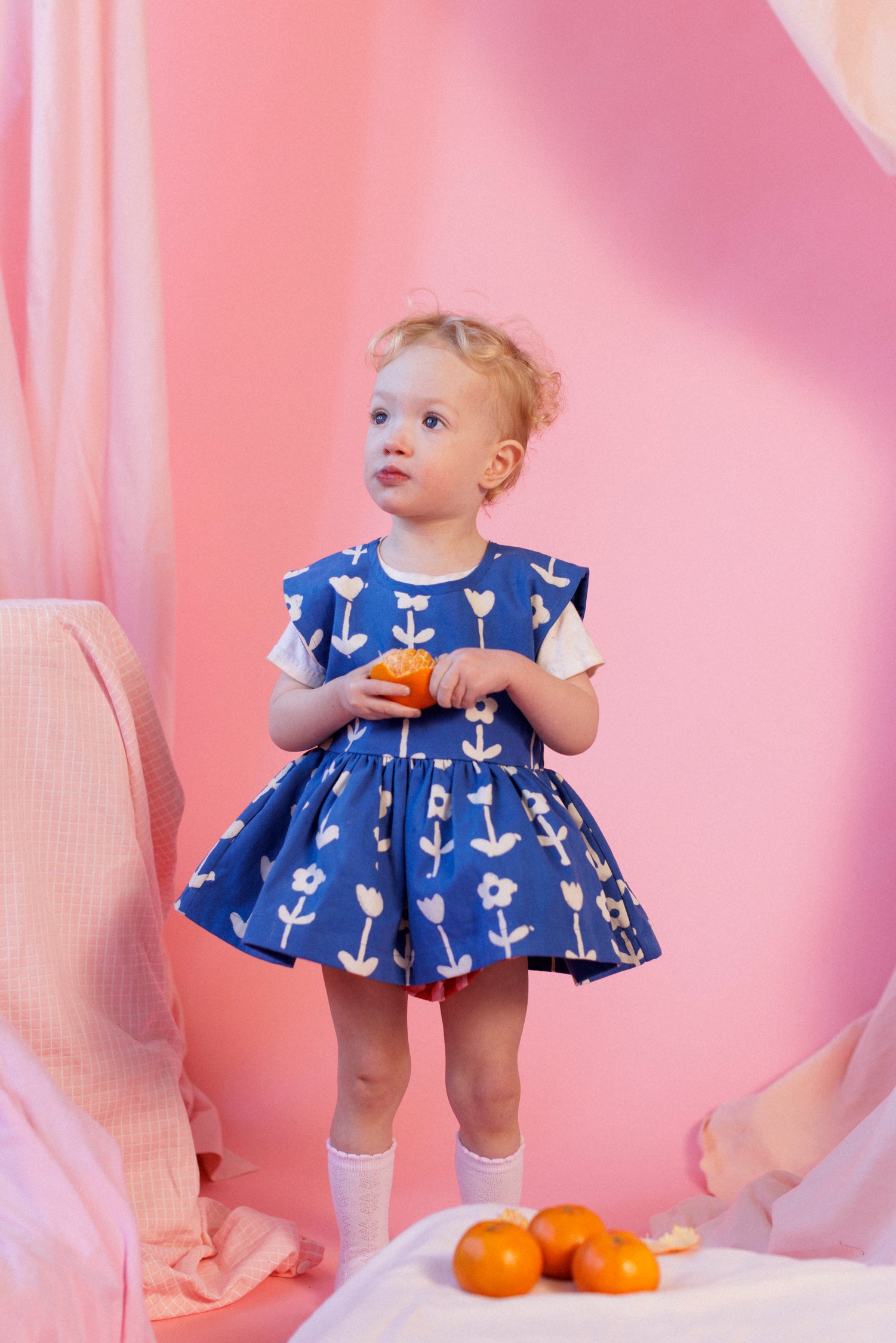 The Little Lake Dress is made from sturdy organic cotton twill, block printed by hand in our Lake House floral. It features a high waist and full skirt—short enough to stay out of the way while climbing, crawling, and twirling—with buttons up the back for easy on and off.