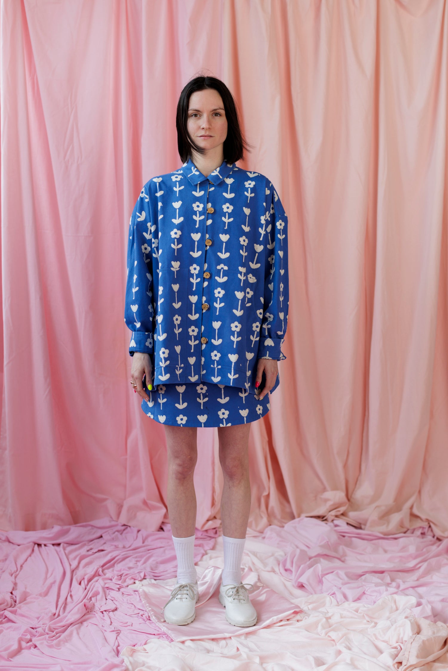Made from sturdy organic cotton twill and hand discharge printed in our Lake House floral, this oversized shirt-coat has a casual structure that wears like your favorite painter’s smock or vintage chore jacket. Big patch pockets, a soft collar.