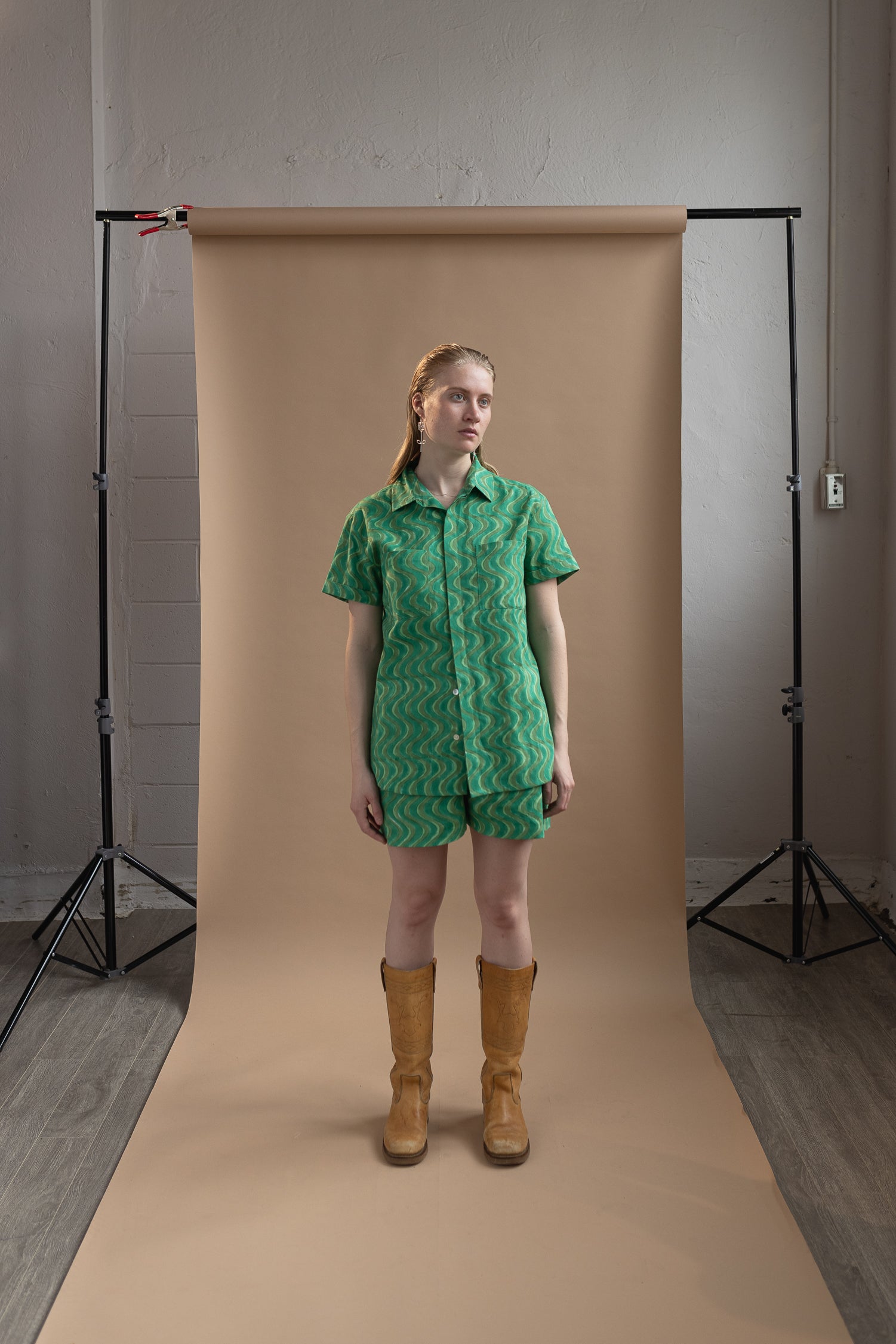 A classic short sleeve button up made with a medium weight organic cotton twill, think: very light weight denim. Available in sizes S-2XL, the small is more like a typical men's small than a woman's so running a little big. Model is 5'7 and wears size small.