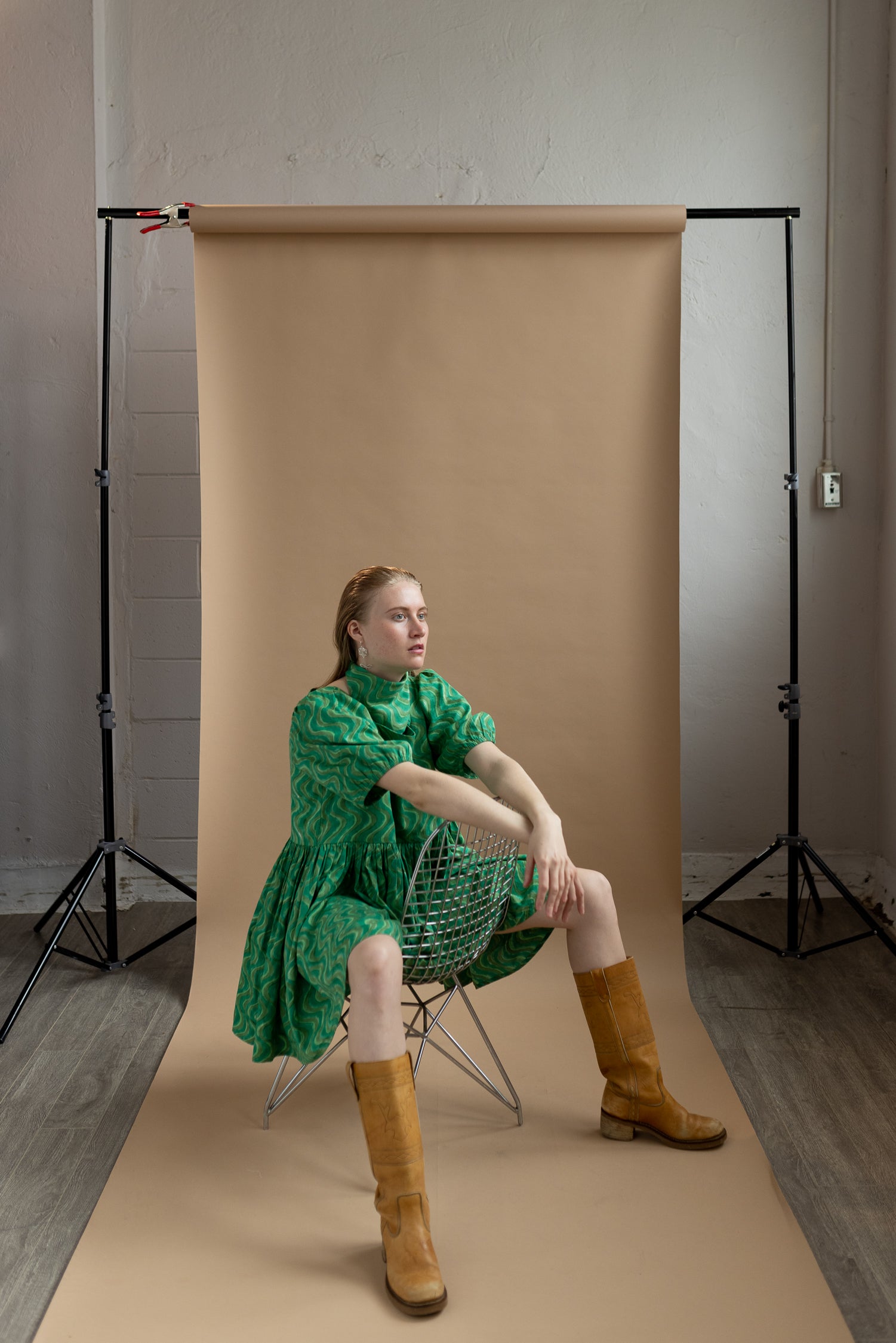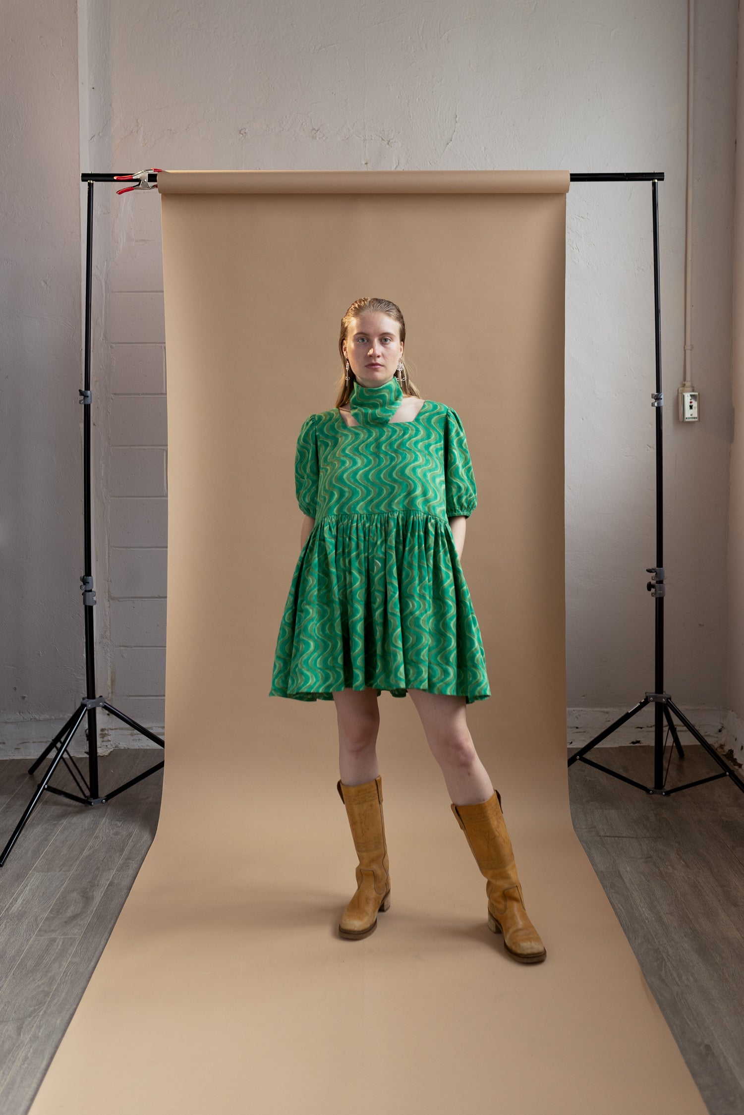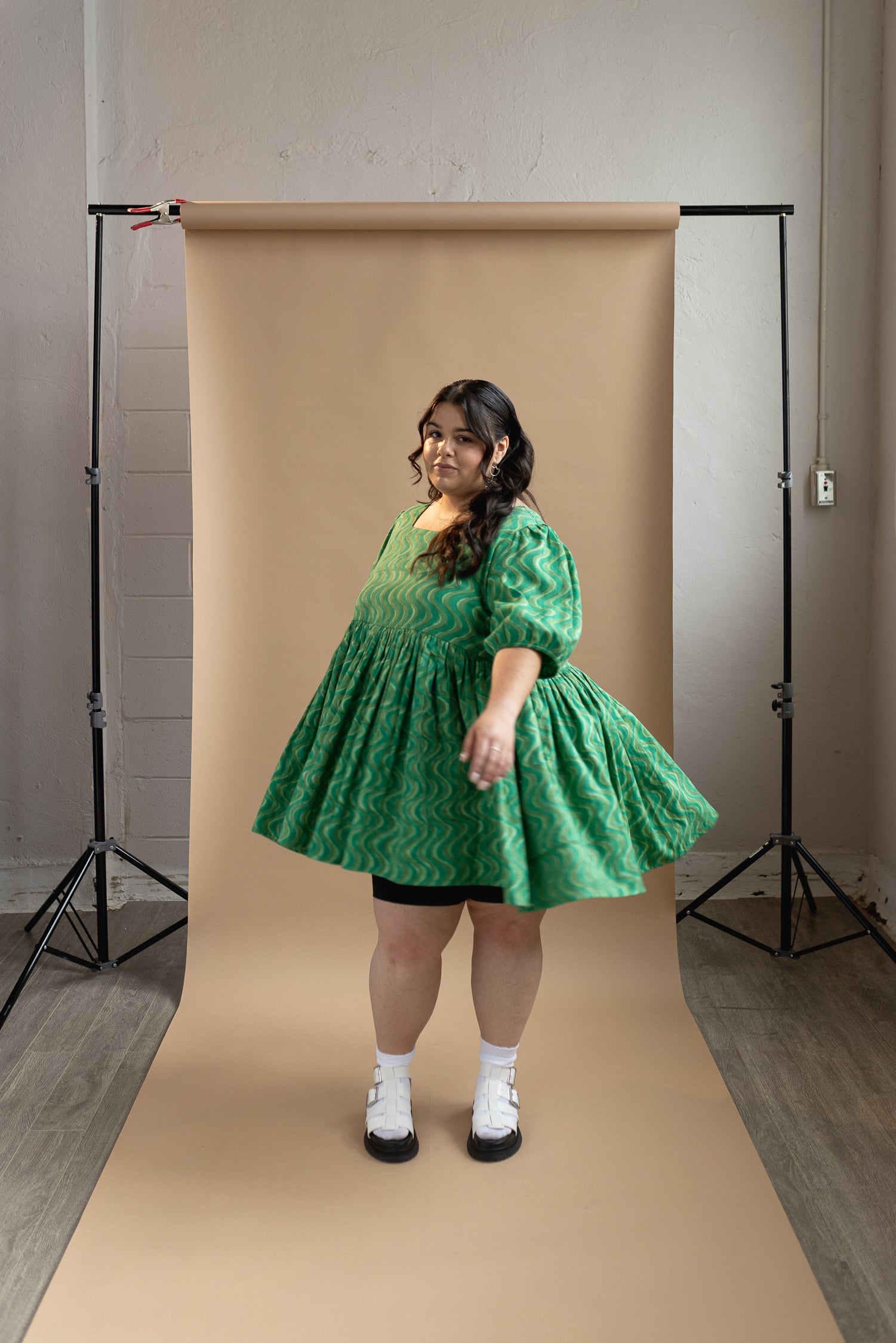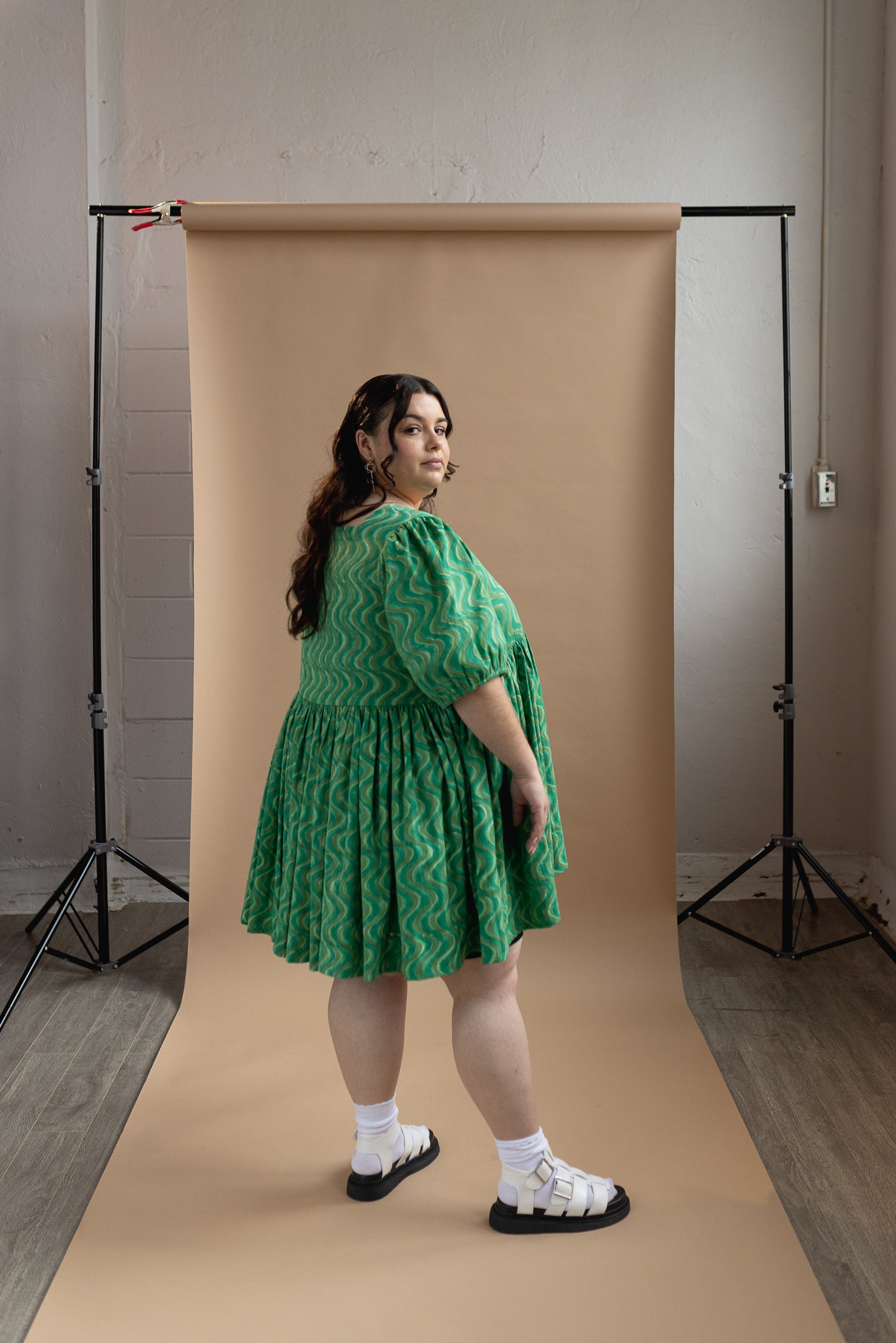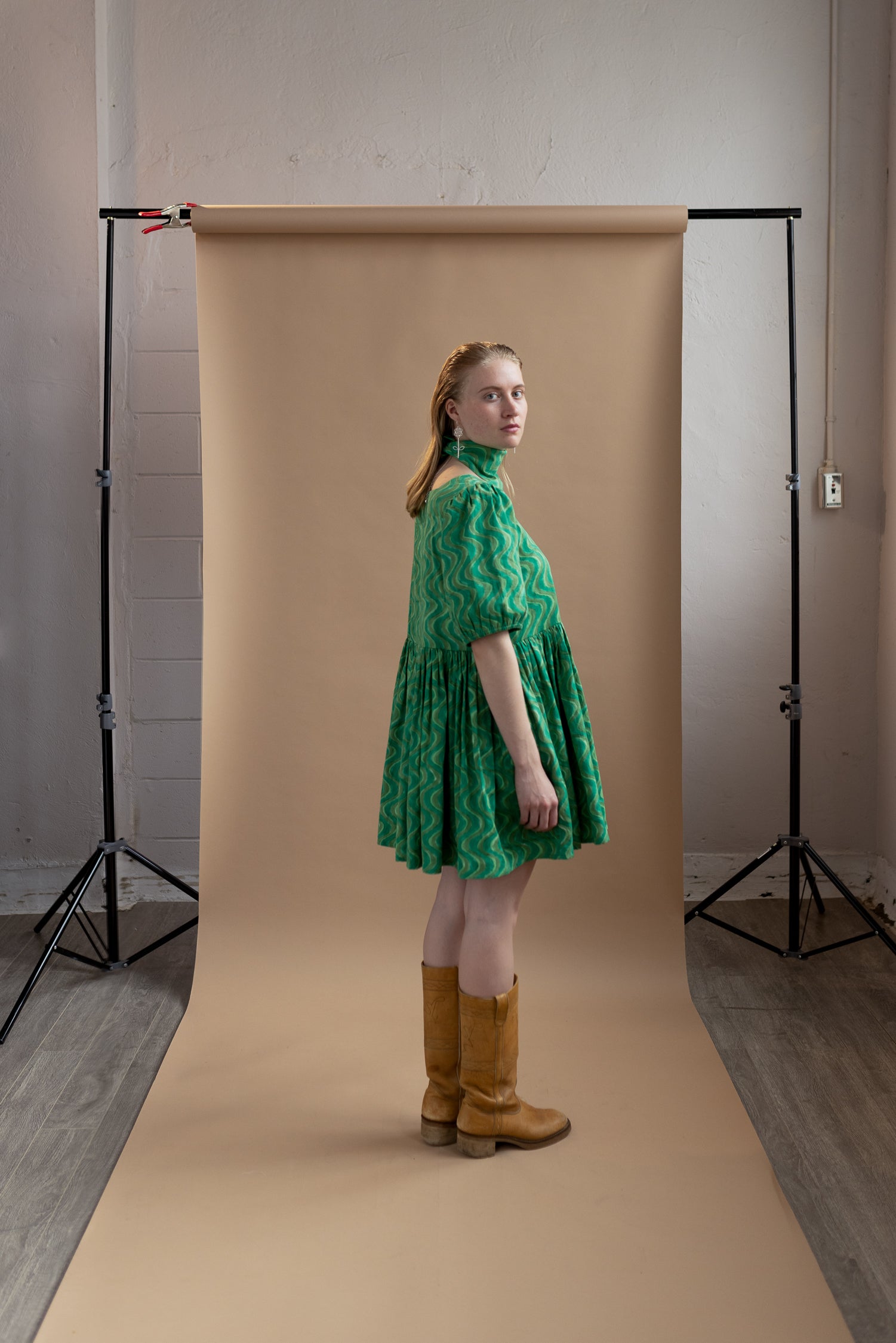 This dress is made with a medium weight hand block printed organic cotton twill. There are pockets in the side seems of a very full skirt that will float around you on hot summer days.